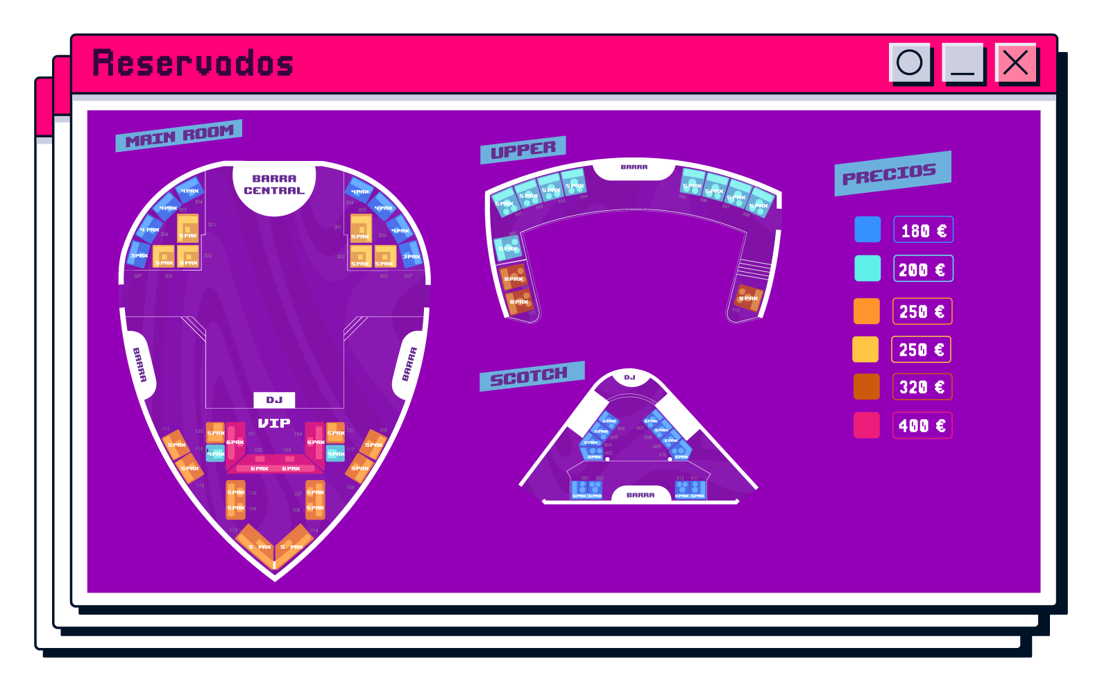 Mesa VIP: Acceso para 5* personas con una botella por mesa. Cada persona tiene pulsera de acceso a esa zona. *En la mesa VIP, si sois 6-7 personas podréis abonar un suplemento por persona de 25€.